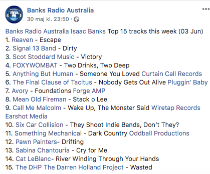 Thank you Banks Radio in Australia for including Cry For Me at the Top 15 Tracks this week!