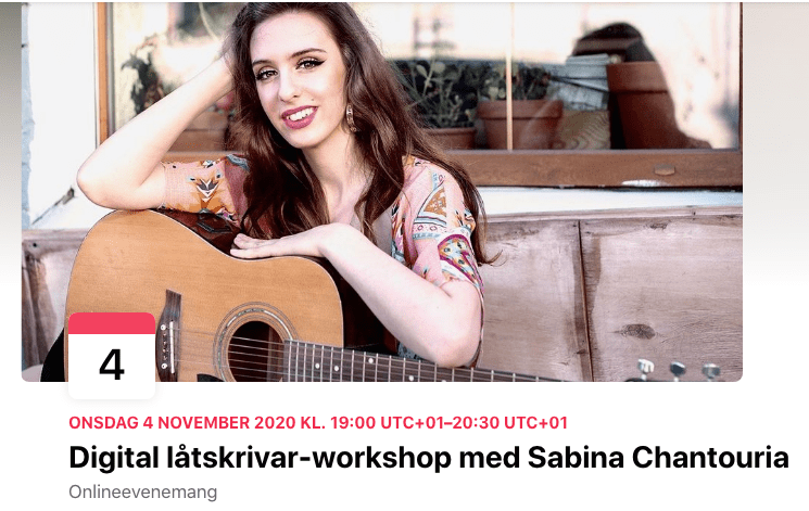4/11 och 11/11 kl 19.30 ger jag workshopen “Skapa din låt” digitalt på Studiefrämjandet Norrköping, Musik Östergötland! För mer info klicka här