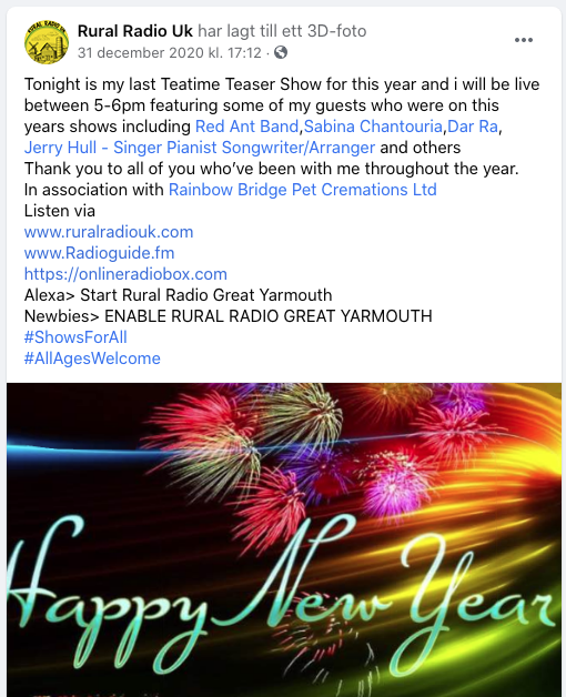 So thankful to be one of the featured guests at the last Brian James Teatime Teaser Show for 2020, Rural Radio UK. Thank you so much for the support!