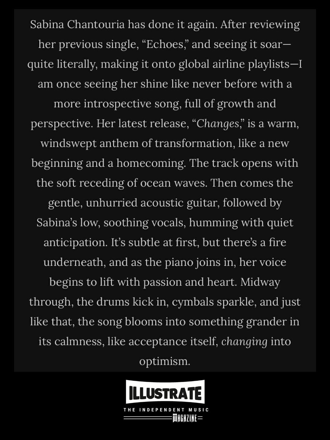 Big shout out to independent music magazine Illustrate Magazine for this wonderful review about my latest single “Changes”!