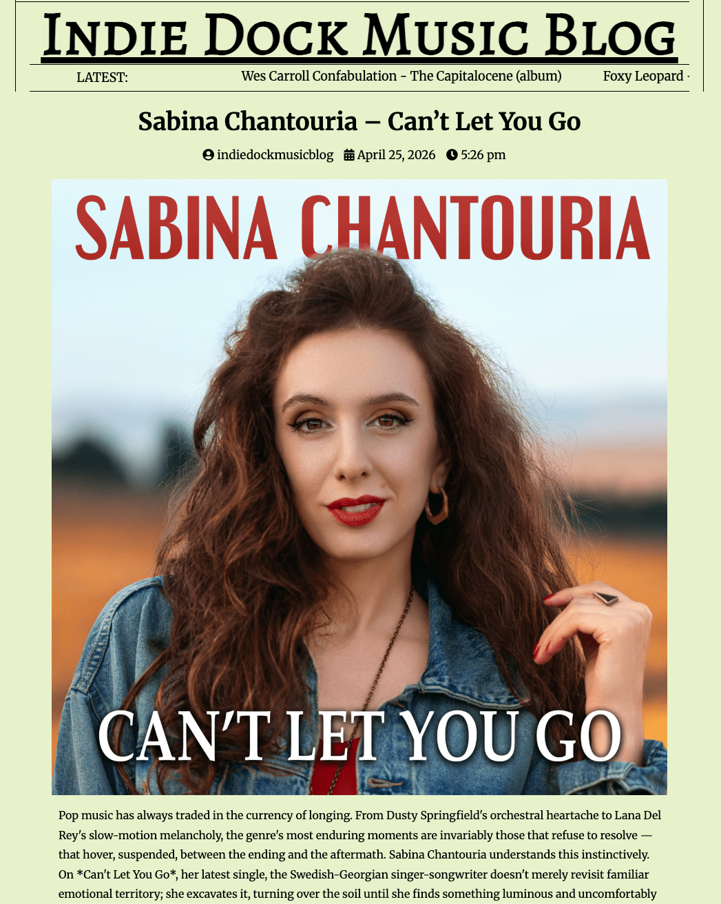 “Pop music has always traded in the currency of longing. From Dusty Springfield’s orchestral heartache to Lana Del Rey’s slow-motion melancholy, the genre’s most enduring moments are invariably those that refuse to resolve — that hover, suspended, between the ending and the aftermath. Sabina Chantouria understands this instinctively….” Read full review here